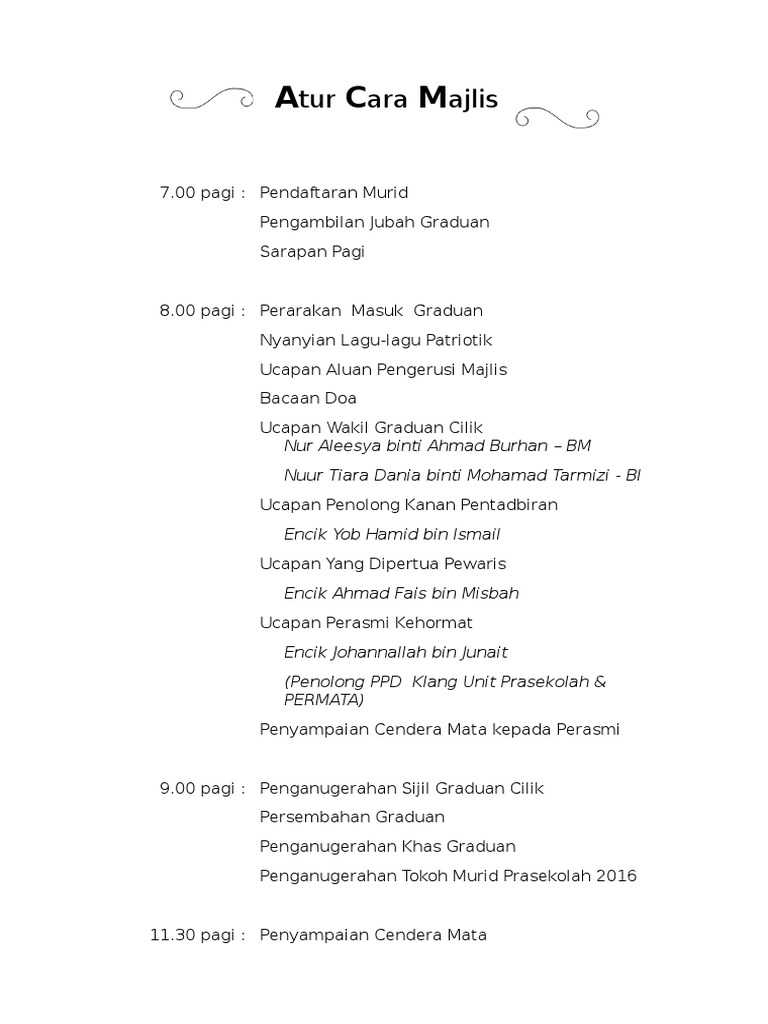 Related : Aturcara Majlis In English - Aturcara majlis hari anugerah sksm 2014 8.30 pagi kehadiran ibubapa 8.45 pagi ketibaan vip 9.00 pagi ucapan aluan pengerusi majlis bacaan al quran ucapan guru besar (tuan haji mohd bin ali) ucapan ydp pibg (en muhammad shukry bin m..