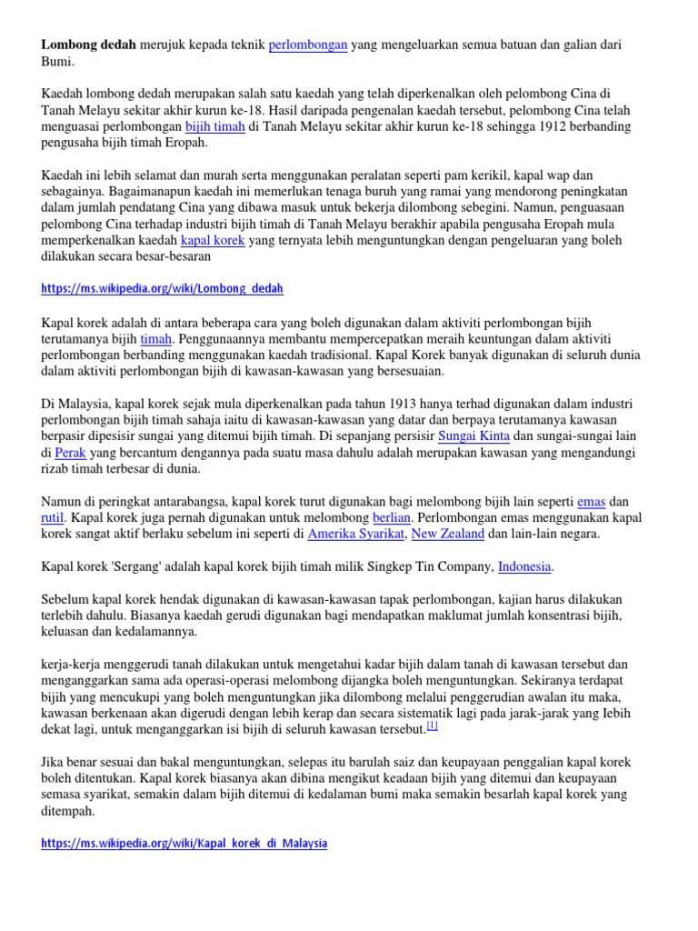 35peningkatan kegiatan perlombongan bijih timah di kawasan pedalaman menyebabkan banyak anak sungai yang cetek akibat timbunan geladak dan sisa bijih. Atsisiųskite, kad galėtumėte skaityti neprisijungę, paryškinti, pažymėti elementus ar užsirašyti pastabas skaitydami knygą „klian intan: Nota lengkap sejarah tingkatan 3. Kaedah melombong bijih timah amiezah kazimah kamarudin mendulang kaedah mendulang sebelum tahun 1820, perlombongan bijih timah diusahakan oleh orang melayu secara tradisional dengan menggunakan kaedah mendulang dan melampan. Dalam konteks negara malaysia, sebelum kedatangan british, orang tempatan di tanah melayu masih menggunakan kaedah traditional dalam bidang ekonomi seperti menjalankan aktiviti pertanian, penternakan dan perikanan, perlombongan bijih timah walaupun pada masa itu orang barat telah.