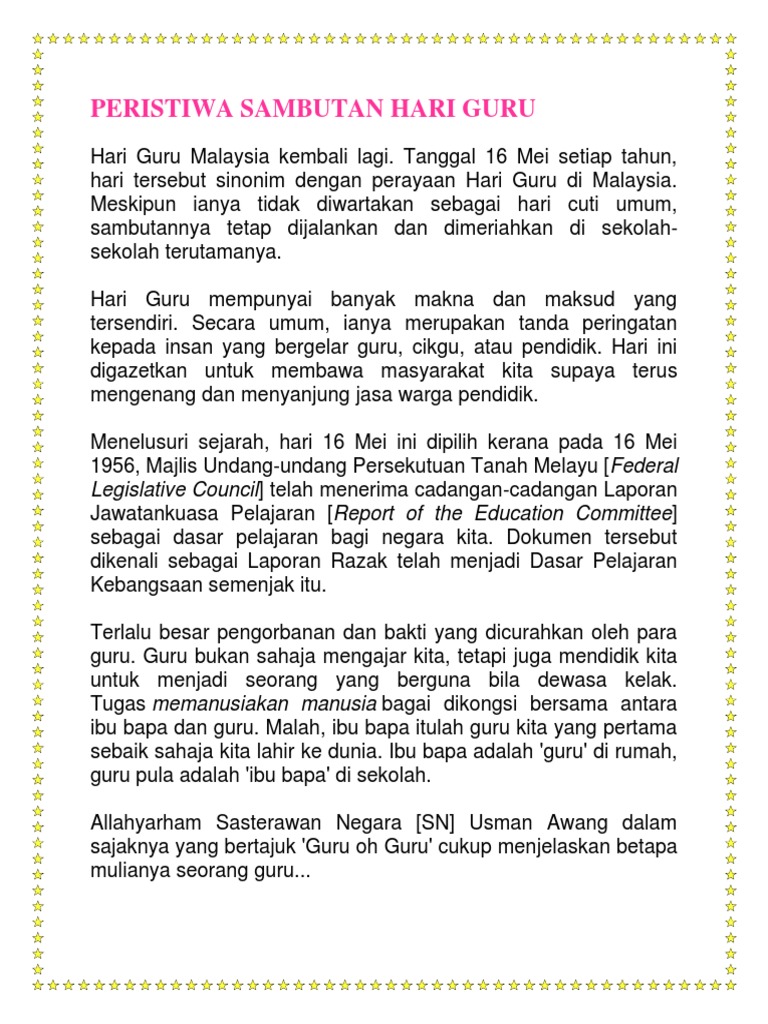 Selamat hari guru buat semua warga pendidik. Sejarah menjadi mata pelajaran wajib lulus bagi peperiksaan sijil pelajaran malaysia (spm) mulai 2013 dan dilaksanakan sebagai mata pelajaran teras mengikut. Tepat seratus hari setelah kemerdekaan indonesia, hari guru nasional turut mewarnai perjuangan kemerdekaan bangsa melalui pendidikan. It is also called hari raya korban and, in by pronouncing what are normally three words as one, aidiladha. Hari ini harus diingat, karena mengingat perjuangan guru di masa penjajahan begitu penuh semangat yang berkobar walaupun mereka tak dibayar. Malaysia pada 16 mei karena pada 16 mei 1965, majelsi undang undang persekutuan tanah melayu menerima rancangan kurikulum dari laporan jawatan kuasa pelajaran. Berikut sejarah lahirnya hari guru dan persatuan guru republik indonesia. Afp photo / mohd rasfan para guru sekolah meletakkan lilin ke lantai saat acara doa bersama untuk korban hilangnya pesawat malaysia airlines mh370, di petaling jaya. Betapa pendidikan memainkan peran yang sangat penting bagi rakyat indoenesia untuk bisa meraih kemerdekaan dari tangan penjajah. Organisasi ini bersifat unitaristik yang anggotanya terdiri dari para. Selamat menyambut hari guru kepada semua guru di merchang khasnya, dan di malaysia secara amnya. Berbeda dengan perayaan hari guru di negara lainnya, hari guru nasional di indonesia bukan menjadi hari libur nasional. Hari guru antarabangsa di amerika latin disambut pada 11 september.
