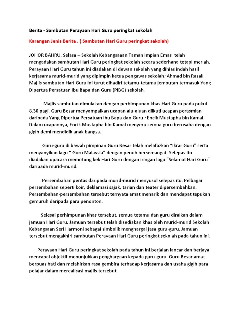 Derma darah sempena hari darah sedunia. Hari guru antarabangsa di amerika latin disambut pada 11 september. Sejarah hari guru tidak terlepas dari bentuk penghargaan terhadap guru sebagai pahlawan tanpa tanda jasa. Jika hari guru nasional ditetapkan pada 1994, hari pgri ditetapkan lebih dahulu, yaitu tahun 1945. Seperti yang kita sedia maklum, hari guru di malaysia disambut pada 16 mei setiap tahun sebagai penghargaan kepada para guru. Berikut sejarah lahirnya hari guru dan persatuan guru republik indonesia. Menitik beratkan peranan guru dalam pembinaan kebangsaan (termasuk perpaduan dan integrasi), pembangunan negara dan perkhidmatan kepada masyarakat. Hari guru ialah hari untuk menghargai jasa guru. Hari guru nasional diperingati setiap tanggal 25 november tentunya tidak lepas dari sejarah perjuangan bapak pendidikan nasional, ki hajar dewantara. Pendidikan di malaysia adalah suatu usaha berterusan ke arah memperkembangkan lagi potensi individu secara menyeluruh dan bersepadu untuk mewujudkan. Hari raya haji is the local malaysian name for the muslim holiday of eid al adha, the feast of sacrifice. Sebelumnya, pgri memiliki nama persatuan guru hindia belanda (pghb) yang didirikan pada tahun 1912 oleh pemerintahan kolonial belanda, lalu menjadi persatuan guru indonesia (pgi) pada 1932. Simak sejarah singkat pgri hingga sejarah hari guru nasional dikutip dari pgri.or.id.